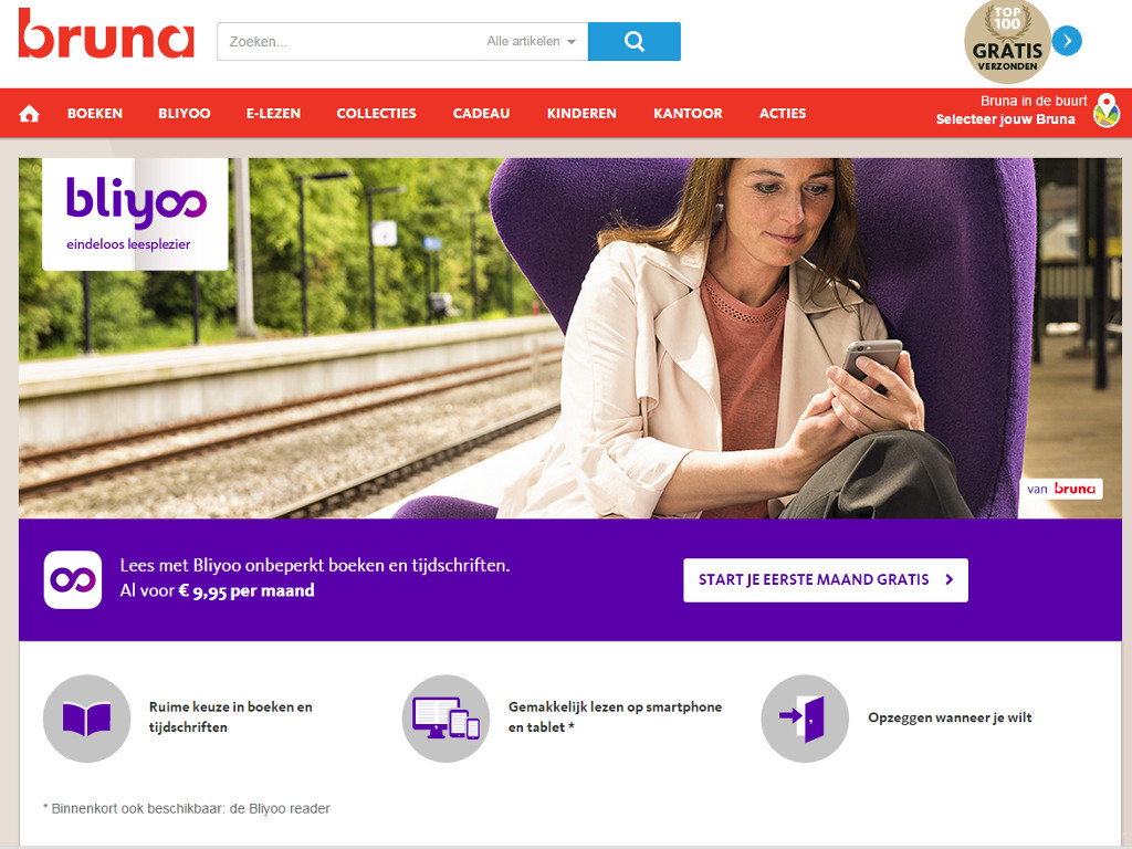 Bliyoo, het digitale tijdschrift- en boekenabonnement van Bruna, is met ingang van woensdag beschikbaar. Gebruikers die zich aanmelden voor de dienst kunnen voor een vast bedrag per maand onbeperkt bladeren en lezen in boeken en tijdschriften. Gebruikers kunnen maximaal drie boeken en drie tijdschriften tegelijk downloaden, die vervolgens ook offline beschikbaar zijn. Wordt een boek of tijdschrift na het lezen verwijderd, dan kan er weer een nieuw exemplaar gedownload worden. De dienst werkt op zowel Android- als iOS-apparaten. Een boeken- óf tijdschriftenabonnement op Bliyoo kost 9,95 euro per maand. Wie beiden wil lezen is 14,95 euro per maand kwijt.
