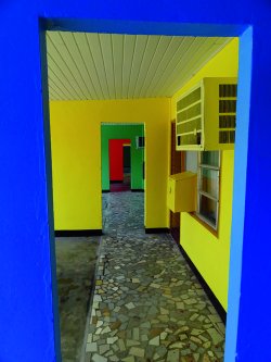 ‘Deze illustraties stonden bij een verhaal over een stel dat vanuit Suriname naar Nederland remigreerde en daar tegen allerlei bureaucratische regelgeving aanliep. Ik ben begonnen met een tekening van een calvinistische boerin afgezet tegen een foto van de warmte van Suriname. Op dat thema ben ik nog even doorgegaan: het strakke van Nederland tegenover het rommelige van Suriname. Uiteindelijk is dit het geworden. De woorden “kastje” en muur voor een schimmige foto met bomen die ik vanuit de trein heb genomen. Je weet niet waar je je bevindt en het is ook een beetje irritant beeld waarvan je denkt: wat wil je nou? Het vervolgbeeld is de foto uit Suriname. Hier zitten het kastje en de muur ook in, maar dan heel kleurrijk. Het vereist enig denkwerk, en het is cryptisch. Ik ben er erg blij mee.’