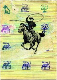 ‘Volkskrant magazine is wat voorzichtiger met beeld. Dat merkte ik toen ik werd gevraagd een tekening te maken bij een artikel over de serie Boer Zoekt Vrouw. Ik bedacht de eerste, met de cowboy, maar dat vonden ze te ver van het verhaal af staan. Er moest een vrouw op, en het moest gerelateerd zijn aan Nederland. Naar mijn idee zit alles wat het programma behelst wél in dit beeld. De letterlijke vertaling van cowboy is koeienman, er zit een huisje, een boompje en een beestje in en hij is op jacht.