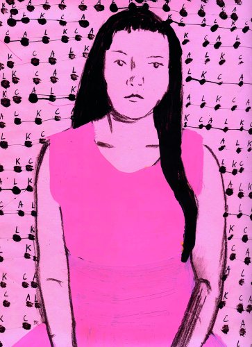 ‘Opzij belde me een tijdje terug om iets te maken bij een verhaal over afvallen. Ik maakte onder andere een roze tekening van een dikkig meisje en een ingesnoerde rollade dat als vervolgbeeld gebruikt kon worden. Leek mij wel spannend, maar daar dachten ze bij Opzij anders over. Ze begrepen het niet, of vonden het te wild. Uiteindelijk kozen ze voor het roze meisje, maar met een ander vervolg. Toen heb ik de derde illustratie gemaakt, een veel letterlijker beeld, tuttig ook.