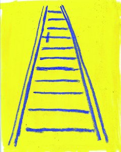 ‘De redactie van Vrij Nederland belde of ik iets kon bedenken bij een verhaal over zelfmoord op het spoor, ze kwamen er zelf niet uit met foto’s. Ik kwam in eerste instantie met de linker illustratie, maar het werd uiteindelijk de rechter omdat ze er kleur in wilden. Zelf vond ik de zwart-witte beter. De zwarte strepen hebben iets van een rouwadvertentie, hij komt heftiger binnen. Ik vind het prima dat de redactie voor de tweede koos. Vrij Nederland is een leuke opdrachtgever die je heel vrij laat, dan is het mooi om in samenspraak te beslissen wat de uiteindelijke keuze wordt.’